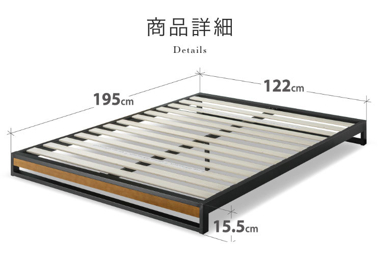 ■商品名Zinus Japan ベッドフレーム 15cm セミダブル■サイズ幅122cm×奥行き195cm×高さ15.5cm座面高:15.5cm■商品重量約23.15kg■材質フレーム:スチールヘッドボード:松材すのこ【代引きについて】こちらの商品は、代引きでの出荷は受け付けておりません。