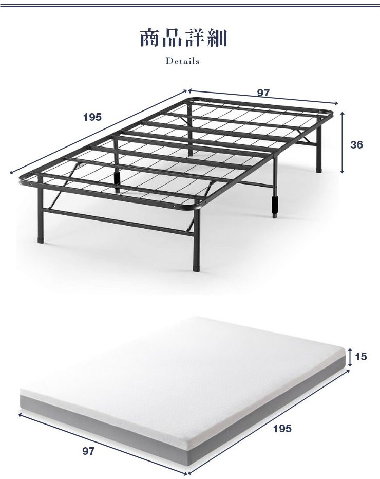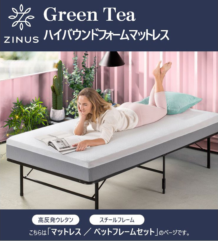 ■商品名Zinus Japan Green Tea ハイバウンドフォームマットレス 15cm シングルZinus Japan ベッドフレーム SmartBase(スマートベース) 36cm シングルマットレスセット■サイズ・マットレス幅97cm×奥行き195cm×高さ15cm・ベッドフレーム幅97cm×奥行き195cm×高さ36cm■商品重量・マットレス約12.86kg・ベッドフレーム約9.07kg■材質組成:外側地/ポリエステル100%、中側地/ポリエステル100%詰め物:ウレタンフォーム(波型)●ウレタン部分かたさ:上層/178N(かため)、下層/178N(かため)上層:2.5cm 高密度フォーム40ILD下層:12.7cm 高密度フォーム40ILD・ベッドフレーム構造:スチール【代引きについて】こちらの商品は、代引きでの出荷は受け付けておりません。